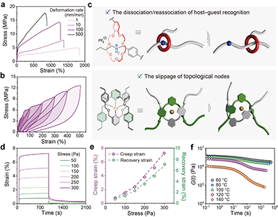 作者进一步研究发现,在外力作用下,由缠结实现的协同共价与超分子聚合物网络的动态行为是影响力学性能的关键。不同应变速率下的拉伸测试表明,其力学行为与速率密切相关。连续循环测试显示,能量耗散随应变线性增长。低应变时阻尼性能最高,主要由主客体作用初步解离贡献;当应变超过200%时,拓扑节点滑移与主客体识别解离共同提升网络韧性与能量耗散能力。蠕变回复测试和应力松弛实验进一步揭示了网络的多重动态响应及其优异的热机械稳定性,其网络结构在高达120 °C时仍保持稳定(图3)。