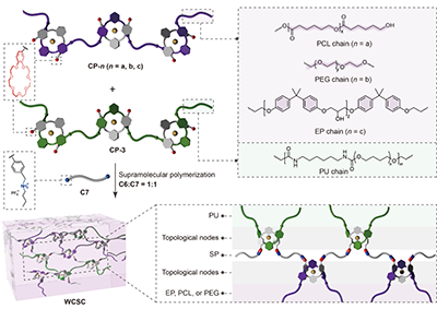 图1. 通过拓扑缠结交联的协同共价与超分子聚合物网络(WCS)的示意图。