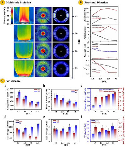 图2. 不同横向拉伸应力场下PBAT薄膜的结构与性能(以固定TUR=15为例):(A) 多尺度结构与膜泡温度演变;(B) 结构尺寸参数;(C) 宏观性能:(a) 纵向与横向断裂伸长率;(b) 纵向与横向断裂应力;(c) 穿刺强度及对应能量;(d) 纵向与横向撕裂强度; (e) 纵向与横向撕裂能量;(f) 水蒸气透过量(WVT)与水蒸气透过系数(WVTC)。
