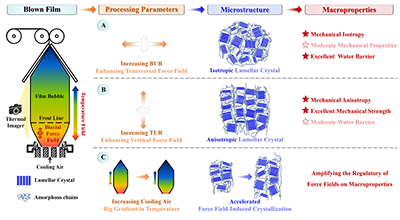 图5. 在吹膜加工外场下,PBAT薄膜结构与性能的演变机制。(A) 当增加吹胀比(BUR)时,具有主导地位的横向拉伸力场对结构与性能的演变机制;(B) 当增加牵引比(TUR)时,具有主导地位的纵向拉伸力场对结构与性能的演变机制;(C) 当增加冷却风环的风速时,梯度温度场对结构与性能的演变机制。