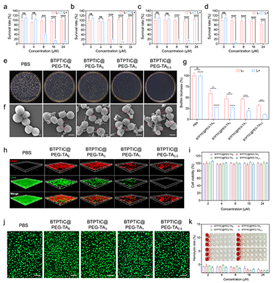 图4.经(a)BTPTIC@PEG-TA6、(b)BTPTIC@PEG-TA3、(c)BTPTIC@PEG-TA1和(d)BTPTIC@PEG-TA0.5纳米胶囊处理后金黄色葡萄球菌的存活率。(e)不同处理条件下金黄色葡萄球菌的照片及(f)扫描电子显微镜图像,比例尺为500 nm。(g)不同处理条件下金黄色葡萄球菌生物膜清除率定量分析。(h)不同处理条件下生物膜的3D共聚焦荧光显微镜图像。(i)不同处理条件下L929细胞的存活率及(j)活死细胞染色图像。绿色与红色分别代表活细胞和死细胞,比例尺为10 μm。(k)BTPTIC@PEG-TA纳米胶囊的溶血率实验。