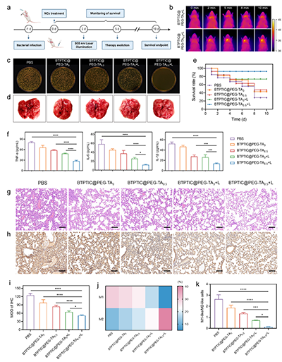 图7.(a)小鼠细菌性肺炎的模型建立和治疗流程示意图。(b)808 nm激光照射下的细菌性肺炎小鼠热成像图。(c)治疗第5天,对小鼠肺部灌洗液中的细菌进行培养后的照片。(d)小鼠肺组织照片和(e)生存率曲线。(f)不同治疗组中,小鼠血清中细胞因子水平(TNF-α、IL-1β、IL-6)。(g)不同治疗后第5天,肺组织的H&E和(h)NF-κB染色图像。(i)肺组织中NF-κB表达的定量统计数据。进行不同治疗后,肺组织中M1和M2巨噬细胞的(j)热图和(k)比例分析数据。
