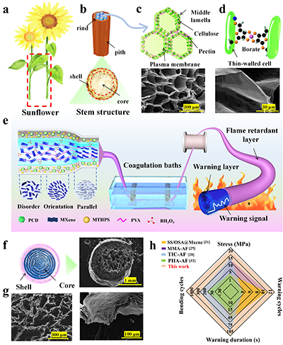 向日葵茎秆具有独特的“刚柔并济”多级构造:内部柔软多孔的髓芯负责储能与物质传输,外部致密坚硬的皮层提供力学支撑与保护,二者通过动态界面实现高效协同。研究团队借鉴这一自然结构,采用同轴湿法纺丝技术,构建了以PVA/MXene复合材料为芯层、模仿髓芯蜂窝结构的温度传感单元,并在外层引入功能性阻燃剂作为保护鞘层,兼具力学增强与抗氧化功能。芯?鞘界面通过硼酸交联形成动态共价网络,显著提升了整体结构稳定性。与现有高温预警纤维相比,CoaxMXeneFib在拉伸强度、预警响应循环次数及持续工作时间等性能上均有显著提升,体现了仿生设计在多功能纤维材料中的有效性。