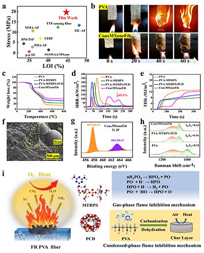 该纤维极限氧指数达44.6%,垂直燃烧60秒后仍保持结构完整,损毁长度仅0.5cm且快速自熄,高温下分解延迟,残炭率为39.1wt%,显著优于纯PVA纤维。其峰值热释放速率、总热释放量及总烟释放量分别降低18.1%、35.2%与6%,火灾危险性显著下降。燃烧后形成致密连续膨胀炭层,可有效阻隔热与氧;XPS与Raman分析表明,MXene催化聚合物基体碳化,提升了炭层石墨化程度。该体系通过凝聚相催化成炭与气相自由基捕获的协同机制,实现高效阻燃。