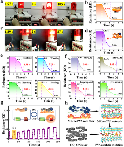 图 4:CoaxMXeneFib在复杂环境下的火灾预警性能与耐久性评估