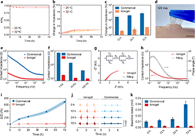 这种兼具固-液特性的状态直接转化为卓越的界面性能。皮肤接触阻抗测试中,离子凝胶的皮肤接触阻抗较商用凝胶降低了一个数量级以上,且连续佩戴72小时后阻抗增幅仅为18%,而对照的商用凝胶阻抗则飙升了690%。这种界面电化学稳定性优势,为高保真电生理信号的长期监测提供了坚实保障。在肌电测试中,离子凝胶电极的信噪比达到49.3 dB,是商用水凝胶的近两倍,并且其监测信号极低的基线噪声使其能够捕捉到微小的手指屈伸动作信号。在心电测试中,离子凝胶同样以36.3 dB的信噪比显著优于商用凝胶的22.2 dB。