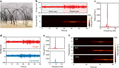 更能够体现这项研究突破性价值的,是脑电图(EEG)的获取。EEG监测历来是非侵入型神经接口的最大挑战,其信号幅值通常小于100 微伏,且需电极穿越毛发屏障与头皮的复杂曲面建立稳定接触。传统非侵入型电极的信号质量严重受限,制约了脑电解码的深度。本研究中,离子凝胶凭借其独特的粘弹平衡特性,既能够如液体般渗透毛发生成无隙界面,又能如固体般驻留原位不流动不塌陷。在枕区视觉皮层的alpha节律记录中,离子凝胶电极的信噪比高达26.3 dB,且在十二小时连续监测中基本维持不变。这不仅是界面材料的进步,更是从能够记录到可靠分析的质变。