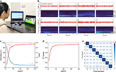 基于信号质量的提升,结合深度学习网络可有效聚焦EEG中的情感相关频段,最终在情绪解码任务中展现出卓越的应用潜力。使用卷积-双向长短期记忆神经网络(CNN-BiLSTM)对离子凝胶采集的高保真EEG信号进行分类,在八类情感状态的识别任务中得到了95%的分类准确率。混淆矩阵分析进一步表明,材料的高保真信号采集能力显著提升了分类器的精准度与泛化能力,为非侵入型脑电监测与情感分类应用提供了可行方案。