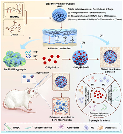 针对上述瓶颈,北京化工大学蔡晴、喻盈捷团队发表最新研究成果,构建了一种具有三重生物粘附能力的多孔微球(Bioadhesive microcryogels, BM),实现外泌体高效生产、功能增强与精准递送的一体化策略,为血管化骨再生提供了新的解决方案(图1)。
