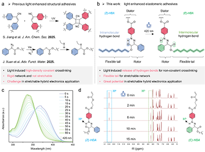 图1. (a) 以往报道的光增强型胶黏剂策略。(b) 本工作中基于腙的光增强型弹性体胶黏剂的设计理念。(c) 在420 nm蓝色LED灯下不同照射时间后(Z)-HBA的紫外-可见光吸收光谱(在DCM中,10-4 mol L-1)。(d) 在420 nm蓝色LED灯下不同照射时间后(Z)-HBA的1H核磁共振波谱(在CDCl3中,10-2 mol L-1)。