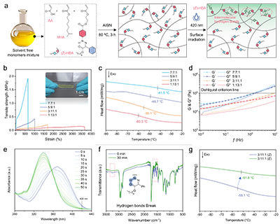 图2: (a) 自由基本体共聚反应及光响应性的示意图。(b) 基于不同单体比例的共聚物的应力-应变曲线,插图为3:11:1弹性体的照片。(c) 基于不同单体比例的共聚物的差示扫描量热(DSC)曲线。(d) 不同单体比例的弹性体的弹性模量(实心点,G'''')和粘性模量(空心点,G'''''''')的频率依赖性。(e) 在420 nm蓝色LED灯下不同辐照时间后,弹性体(3:11:1,在二氯甲烷中,10-3 mol L-1)的紫外-可见光吸收光谱。(f) 弹性体(3:11:1)在420 nm光辐照前后的傅里叶变换红外光谱(FTIR)光谱。(g) 基于(Z)-HBA和(E)-HBA的共聚物(3:11:1)的差示扫描量热曲线。