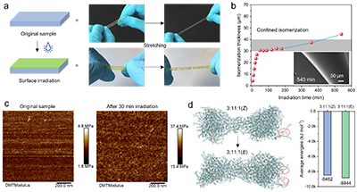 图3. (a) 机械拉伸前后,弹性体薄膜在原始状态与辐照状态下的照片。(b) 光异构化深度随辐照时间的变化关系;插图展示了辐照540分钟后弹性体表面的典型扫描电子显微镜(SEM)图像。(c) 利用原子力显微镜(AFM)测得的原始弹性体表面与光辐照后弹性体表面的杨氏模量分布图。(d) 基于(Z)-和(E)-HBA的弹性体的分子动力学(MD)模拟所得的平衡构型及相互作用能。