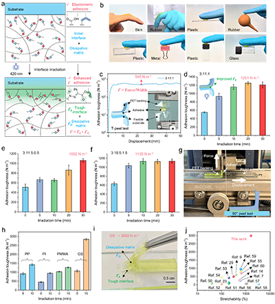 图4. (a) 通过在粘合界面照射420 nm以增强粘附力的示意图。(b) 弹性体对各类基材的粘附情况。(c) 3:11:1弹性体在PET基材上的T型剥离力随位移的变化关系。 (d-f) 在不同照射时间与单体投料比例下,弹性体在PET基材上的粘附韧性数据。 (g) 90°剥离测试装置的照片与示意图,以及安装在刚性基材(如玻璃)上用于粘附力测量的样品。(h) 3:11:1弹性体在多种基材上照射10分钟前后的粘附韧性对比(PP:聚丙烯;PI:聚酰亚胺;PMMA:聚甲基丙烯酸甲酯;GS:玻璃片)。(i) 玻璃片上经照射后的弹性体照片,显示出其具有高能量耗散和强韧的界面粘合特性。(j) 本胶黏剂与先前报道的弹性体胶黏剂在粘附韧性与拉伸性方面的对比。
