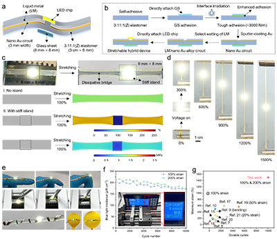 实验结果也充分验证了这一设计的有效性。经10分钟光照处理后,该胶黏剂对玻璃、PMMA、PET、PP等多种常见基材的粘附韧性均获得显著提升,展现出广泛的适用性。基于此,团队成功制备了具有“岛-桥”结构的可拉伸混合电子器件。测试显示,得益于胶黏剂本体优异的可拉伸性和界面处显著增强的粘附力,即便在高达1500%的极端拉伸应变下,器件依然能保持完整的结构和稳定的电学性能。更令人印象深刻的是,在200%应变的反复拉伸测试中,它能够稳定运行超过10000次,展现出卓越的耐久性。