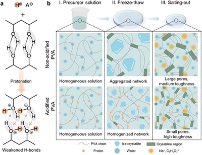 在传统PVA水凝胶形成过程中,聚合物链间的氢键往往在早期迅速建立,这虽然能够稳定结构,却同时限制了链段的重新排布空间,导致网络内部存在不均匀区域。研究团队提出,通过酸处理对PVA链段进行可逆质子化,可以暂时削弱氢键作用,让链条在凝胶化初期拥有更高的自由度,先让链段充分重排,形成均一网络,再通过后续处理将结构固定下来。基于这一理念,团队发展了“酸化—冻融—盐析”的加工路径。其中,酸化处理调控链段质子化状态,抑制过早氢键形成;冻融循环诱导形成基础凝胶网络;盐析处理强化链间相互作用并形成稳定的结晶物理交联。这一多阶段过程使得分子取向与网络结构能够逐步优化,从分子尺度到宏观结构实现协同强化。