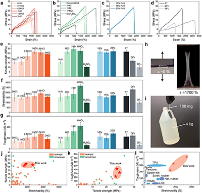 质子化调控链段运动性的设计策略,通过酸化、冻融与盐析协同作用,抑制氢键过早形成并构筑均一网络结构,成功制备兼具高强度、高延展性与超高韧性的各向同性PVA水凝胶。该材料拉伸强度达29.5 MPa、伸长率2683%、韧性424 MJ m?3,为高性能软材料与软体机器人应用提供新思路。