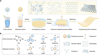 图1 溶剂化介导组装合成大面积自支撑COF膜示意图