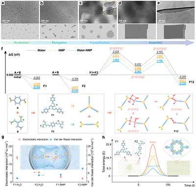 为此,中国科学技术大学徐铜文教授、李兴亚特任教授团队报道了一种溶剂化介导组装策略(SMA)(图1),成功合成了面积达~2400 cm2、拉伸强度为~65 MPa的大面积自支撑COF膜(图2)。通过原位加热液体透射电子显微镜可视化了溶剂介导的成核、生长、结晶及组装过程,结合多尺度模拟详细阐明了膜形成过程中的溶剂化相互作用(图3)。该方法具有很好的普适性,可以实现一系列不同荷电性质和拓扑连接方式COF膜的制备。