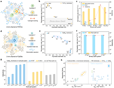 基于SMA策略制备的自支撑TATGCl膜富含氢键位点,通过与不同水合阴离子之间氢键相互作用差异实现了高效的单多价阴离子分离。在单盐体系中,一价阴离子与SO?2-的理想选择性在~150至~1100之间。在双盐体系中,由于离子竞争效应,一价阴离子与SO?2-的选择性下降至~30至~700。制备的TpEBBr膜通过孔道内的正电荷与不同阳离子之间静电相互作用差异实现了单多价阳离子的高效分离。在单盐体系中,阳离子渗透速率顺序为:H? > 碱金属离子(K?、Na?、Li?)> 碱土金属离子(Ca2+、Mg2+、Fe2+)>> 稀土金属离子(Ce3+、La3+、Sc3+)。其对H?/碱金属离子选择性约为10,H?/碱土金属离子选择性达到102,而H?/稀土金属离子选择性在104至105之间。在双盐及多盐体系中,TpEBBr膜对H?/稀土金属离子的选择性仍能维持在2×104。相比于传统离子交换膜、自聚微孔聚合物膜及商业膜,制备的TATGCl和TpEBBr COF膜同时实现了高离子渗透性和高选择性,打破了传统离子膜选择性和通量之间的相互制约,展示了其在高盐废水处理和稀土金属离子回收应用中的巨大潜力。