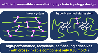 总之,通过链形态设计可实现聚合物高效可逆交联,获得综合性能优异的自愈合、可回收胶粘剂,这一制备思路具有以下特色和优点: