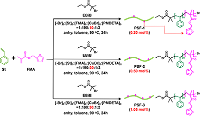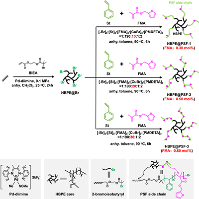 该研究首先通过“链行走”乙烯聚合和ATRP技术相结合,设计合成了两类具有不同链形态但组成类似的可逆交联大分子。其一为HBPE@PSF2),其具有超支化多臂链形态,由超支化聚乙烯(HBPE)和线形聚苯乙烯侧链(PSF)构成,其中PSF侧链中含有少量可逆交联组分(呋喃单体FMA0.30?0.80 mol%)。另一为线形共聚物PSF3),由苯乙烯和少量可逆交联组分(0.20?1.05 mol%呋喃单体FMA)共聚而成。通过投料比例的控制和改变,可对上述共聚物结构中的可逆交联组分FMA的比例进行调控。