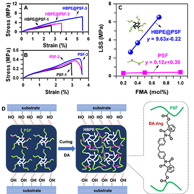 随后,对两类可逆交联体系的粘接性能进行了比较。发现尽管所得HBPE@PSF具有较低的可逆交联组分比例(0.80 mol%),但交联后其粘接性能可得到明显提升,以玻璃基底为例,其搭接剪切强度可由固化前的0.85 MPa提高到固化后的6.41 MPa,提高了近7.5倍(7)。同时,在聚乙烯、天然橡胶、聚四氟乙烯、金属铝和陶瓷等一系列其它基材表面,该共聚物固化后也呈现出较强的粘接性能,显示出优异的基材适应性。此外,通过与线形PSF交联体系对比,发现具有超支化多臂结构的HBPE@PSF体系具有显著更优的粘接性能(8),在玻璃基底表面,随着可逆交联组分比例逐步提高,前者的搭接剪切强度呈现出显著更快的增长速率,约为线形体系的80倍。
