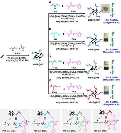 进一步,对上述高效可逆交联思路的可推广性进行了考察。参照所述HBPE@PSF的合成方法,通过“链行走”乙烯聚合和ATRP技术相结合,分别以丙烯酸甲酯、丙烯酸丁酯、乙基丙烯酸甲酯和含氟单体为主要原料,通过引入少量可逆交联组分FMA,设计合成了一系列超支化多臂可逆交联大分子(11),对其结构组成进行了表征,并对其粘接性能进行了初步评价。发现上述各类超支化多臂共聚物与HBPE@PSF类似,尽管含有较低比例的可逆交联组分,但固化后也均展现出优异的粘接性能,表明该思路具有很好的普适性。