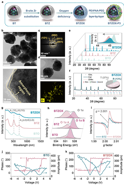 图2. BTZOX-P3纳米材料的设计与结构表征。a BTZOX-P3纳米材料的制备过程。b BTZOX-P3的透射电子显微镜图像。c BTZOX-P3的选区电子衍射图谱和d 元素分布图。e BT、BTZ和BTZOX的X射线衍射图谱。f BTZOX的Rietveld精修结果。g 拉曼光谱。h O1s的X射线光电子能谱。i BTZ和BTZOX的电子顺磁共振谱。j BTO和k BTZOX纳米颗粒的压电力显微镜表征。