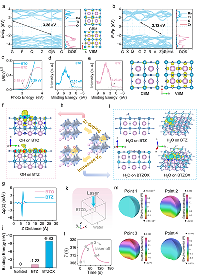 图5. DFT计算揭示的BTZ电子结构与界面结构。a BTO和b BTZ的轨道投影电子能带结构和投影态密度。插图为价带顶和导带底的轨道排布示意图。C BTO和BTZ的Tauc plots。d BTO和e BTZ的价带XPS谱。f OH吸附在BTO和BTZ上的电荷密度差。g BTO-OH和BTZ-OH的平面平均电荷密度差。h 通过Zr掺杂和氧空位设计的BTZOX结构。i H?O吸附在BTZ和BTZOX上的电荷密度差。j H?O在BTZ和BTZOX上的吸附能。k 有限元模拟示意图。l 周期性热循环中选取的温度阶段,以及m 有限元模拟对应的BTZOX-P3纳米颗粒热释电势分布。