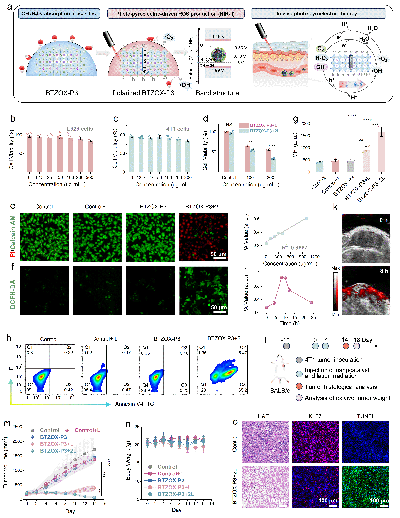 图6. 体外与体内光-热释电治疗a BTZOX-P3的热释电催化活性氧生成机制及体内光热释电治疗示意图。b L929细胞和c 4T1癌细胞与BTZOX-P3纳米材料孵育24小时后的细胞活力。d 4T1细胞在BTZOX-P3纳米材料处理并接受1064 nm激光照射后的细胞活力。e不同处理后,经钙黄绿素AM/PI染色的4T1癌细胞共聚焦激光扫描显微镜图像。f不同处理后,经DCFH-DA染色的4T1癌细胞荧光图像。g经DCFH-DA染色的细胞内ROS流式细胞术分析。h 不同处理后,经Annexin V-FITC/PI染色的4T1癌细胞流式细胞术分析。i不同浓度BTZOX-P3的体外光声信号强度。j注射BTZOX-P3后不同时间点肿瘤部位的光声图像及k 相应时间肿瘤区域的光声信号强度。l治疗过程示意图。m不同治疗组小鼠的肿瘤体积变化。n各组小鼠治疗后体重增长曲线。o不同治疗组肿瘤组织的H&E染色、Ki-67免疫组化染色和TUNEL染色。
