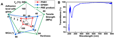 3 左图:主链编辑对COPs材料的性能提升效果。右图:所得COP树脂的透光性能。