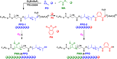 以环氧丙烷(PO)开环均聚反应到丙烯酸甲酯(MARAFT聚合反应的串联为例,强亲核性烷氧基活性物种与三乙基硼(Et3B)紧密结合,从而抑制其与氧气反应生成自由基。加入酸酐后,烷氧基物种可高效、定量转化为亲核性较弱的羧酸根物种,通入氧气可有效启动RAFT聚合反应,生成聚丙烯酸酯- b-聚醚两嵌段共聚物PMA-b-PPO