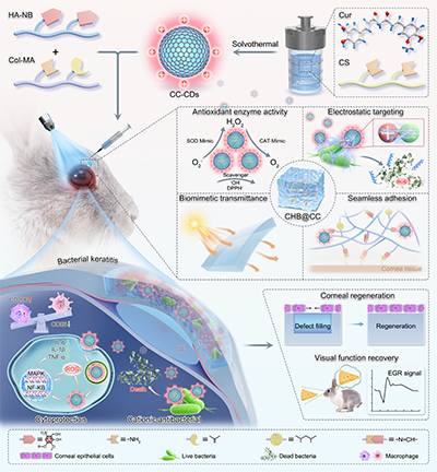 近期,四川大学生物医学工程学院/国家生物医学材料工程技术研究中心孙静/范红松团队针对细菌性角膜炎治疗中病原体滋生与炎症损伤并存的临床挑战,利用水热法将壳聚糖与姜黄素前驱体转化为带正电荷的碳点(CC-CDs),实现了类酶抗氧化活性与靶向抗菌功能的有效整合。研究团队首先通过密度泛函理论(DFT)从分子水平揭示了碳点的催化机理,验证了其非活性氧依赖的选择性抗菌机制,克服了传统抗菌系统易导致宿主细胞无差别损伤的局限性。随后,团队将该具有类酶活性的CC-CDs引入光敏胶原/透明质酸基质中,构建了一种兼具免缝合粘附功能与时空协同治疗效应的复合类酶水凝胶(CHB@CC)。该水凝胶不仅展现出优异的透明度、组织粘附力及活性氧(ROS)清除能力,更能诱导巨噬细胞向抑炎型(M2型)极化。在新西兰兔细菌性角膜炎模型中,该体系实现了创面的即时密封与早期抗炎杀菌,并通过抑制瘢痕生成、引导角膜组织无瘢痕愈合,成功恢复了眼球的光电信号转化功能。这项研究为构建安全、高效的新型抗菌纳米医药系统提供了理论依据,也为角膜损伤后的微环境调控与功能再生提供了新的临床转化思路。