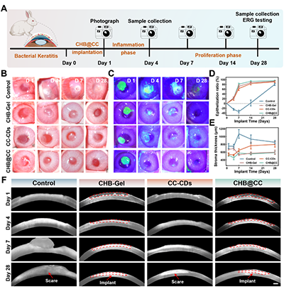目前,细菌性角膜炎的临床治疗方案涉及局部抗生素滴眼液到缝合式角膜移植,但均难以同时兼顾感染控制、炎症调节与组织再生。为协调高效抗菌与宿主组织保护之间的矛盾,研究人员开发了一种可注射的仿生复合基质,该基质由光响应型胶原/透明质酸-硝基苯偶联物(CHB)水凝胶与源自姜黄素和壳聚糖的多功能碳点(CC-CDs)集成而成。注射后,CHB水凝胶可在原位形成透明且具有粘附性的界面;同时,CC-CDs利用其阳离子壳聚糖组分靶向破坏细菌细胞膜,并发挥姜黄素衍生的纳米酶活性以维持细胞内的氧化还原平衡。值得注意的是,相比于疏水性姜黄素,CC-CDs的水溶性提升了4000倍以上,显著增强了其抗氧化效能,并实现了前所未有的双重效应:在接近完全清除细菌的同时,保持了98%以上的细胞存活率。基于这种优异的生物相容性,该复合水凝胶进一步促进了巨噬细胞向再生型M2表型极化。体内实验结果显示,该材料在24小时内使细菌载量降低了90%,在第4天将抗炎细胞的招募量提升了6倍,并在第28天抑制了91.8%的纤维化标志物,同时恢复了87.5%的视网膜信号幅度。这些研究结果突显了该复合水凝胶通过微创微环境调节,实现无瘢痕结构修复与视觉功能恢复的协同能力,为替代传统眼科手术提供了新策略。