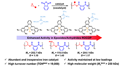 聚烯烃已经成为现代生活中不可或缺的材料,但是其稳定的全碳主链结构使其难以自然降解,造成了不容忽视的环境污染问题。相比之下,聚酯因含有易于水解的酯键结构,并具备理想的单体-聚合平衡,展现出可降解和化学回收的潜力,成为替代不可降解的聚烯烃的理想选择。将大宗烯烃原料环氧化后,与廉价的环状酸酐进行开环共聚,是价格经济、性能可调的聚酯合成方案之一。但这一方案目前受限于分子量较低的挑战,所得聚酯材料性能有限,制约着其进一步应用。因此,通过对催化体系的理性设计来提高聚酯的分子量,继而提高聚酯的性能一直是学术界极为关注的研究热点之一。在众多催化体系中,席夫碱催化剂因活性高、结构可调、易于合成等优势备受关注。其中,铁元素毒性低,生物相容性好,完美契合可降解高分子绿色合成理念。然而,与传统席夫碱金属催化剂相比,席夫碱铁催化剂在开环共聚中仍面临催化活性与可控性的双重挑战。
