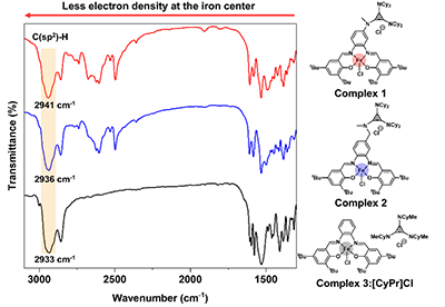 作者合成了一系列席夫碱铁催化剂,并利用红外光谱、紫外-可见光谱以及循环伏安法系统研究了其金属中心的电子特性。红外光谱(图2)和紫外-可见光谱分析表明,新型双功能席夫碱铁催化剂(配合物1)的金属中心具有更低的电子密度和更强的路易酸性;循环伏安法的测试结果进一步为这一结论提供了定量评估的依据。