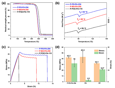 得益于配合物1在低催化剂负载条件下的优异催化性能,作者进一步探索了高分子量聚酯的合成,并成功制备一系列目标产物。这些高分子量聚酯为进一步探究其结构-性能关系提供了理想样本(图4)。测试结果表明所得聚酯材料的性能优于同类材料。以P-PO-PA-254为例,其拉伸强度与聚丙烯、聚苯乙烯相当,同时脆性更低,展现出作为商用塑料潜在替代品的广阔应用前景。