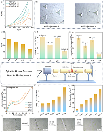 纳米压痕测试揭示了材料力学性能随PBA含量的演变规律:随着PBA含量增加,弹性模量从1.48 GPa提升至3.92 GPa,硬度高达0.36 GPa,接近聚酰亚胺甚至铝合金水平。然而过高PBA含量因空间位阻导致交联密度饱和,力学性能不升反降。分离式霍普金森压杆测试进一步证实其卓越抗冲击性:POSS@PBA-4:1在高速冲击下仍保持结构完整,最大流动应力达695 MPa,冲击韧性高达258.14 J cm-3。这一优异性能源于双重协同机制——快速氢键瞬时耗能,慢速硼酸酯交换驱动结构恢复。此外,材料经多次再加工后力学性能几乎无衰减,且在接近玻璃化转变温度时展现出划痕自修复能力,为极端条件下的应用提供了可靠保障。
