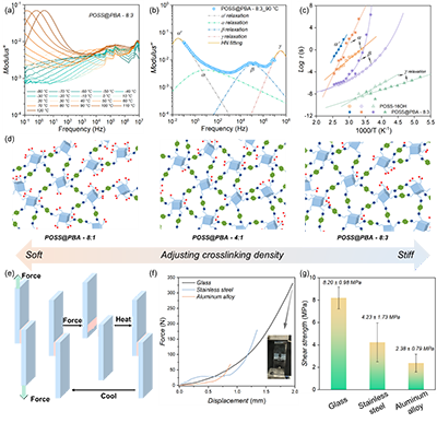 为揭示其优异力学性能的物理起源,研究者采用宽带介电谱对材料的动力学行为进行探测。与POSS前驱体相比,交联后的POSS@PBA-8:3在高温区出现归属于硼酯键交换动力学的额外松弛过程,其α和β松弛因结构受限而显著减慢,而γ松弛因PBA插入导致POSS间距增大反而加快——快速次级松弛的保留为材料在高速冲击下实现高能量耗散提供了结构基础。动态共价键与密集氢键的协同作用,构筑了兼具高模量、高硬度和优异抗冲击性能的强韧网络。在粘附性能方面,POSS@PBA对玻璃表面展现出高达8.20 MPa的剪切强度,破坏模式为内聚破坏,证实其界面键合强度已超越材料自身内聚强度。硼酸酯键的水解敏感性赋予材料按需脱粘的刺激响应特性,进一步拓展了应用场景。经济高效的制造工艺与闭环可回收性,使该材料高度契合当前绿色生产与原子经济性的发展理念。