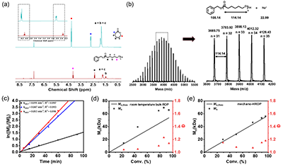 图3. (a)反应混合物在CDCl?中的1H NMR谱图。(b)PCL的MALDI-TOF质谱图。(c)ε-CL在不同聚合条件下的动力学图。(d)ε-CL的传统室温本体聚合下的Mn与D随转化率的变化曲线。(e)ε-CL在mechano-HROP条件下Mn与D随转化率的变化曲线。