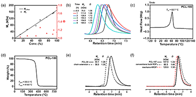 图4. (a)DP为1500下?-CL的mechano-HROP过程的Mn和D与反应转化率的关系图;(b)DP为1500下ε-CL的mechano-HROP过程的反应动力学GPC曲线;(c)高分子量PCL的DSC曲线;(d)高分子量PCL的TGA曲线;(e)mechano-HROP下扩链实验的GPC曲线;(f)与传统本体ROP的扩链对比实验的GPC曲线。