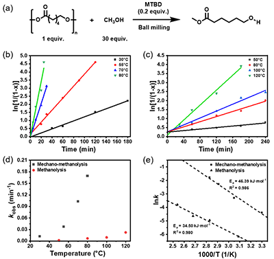 图6. (a)PCL的mechano-methanolysis;(b)PCL的mechano-methanolysis动力学;(c)加热搅拌下PCL的甲醇解动力学;(d)不同条件下PCL的甲醇解表观速率常数;(e)PCL的mechano-methanolysis与搅拌甲醇解的阿伦尼乌斯图。