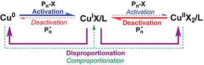 • 两种平衡共存:1) 铜种之间的相互转化平衡(歧化/归中)和 2) 聚合平衡(活化/失活,增长和终止)。