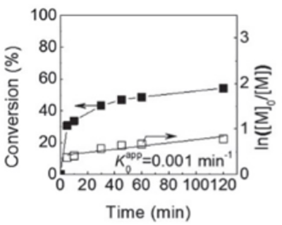 随着研究的深入,王教授他们同时也注意到Cu(0)活性自由基聚合体系中一个很有意思的现象——诱导期(induction period - 单体转化率几乎为零。