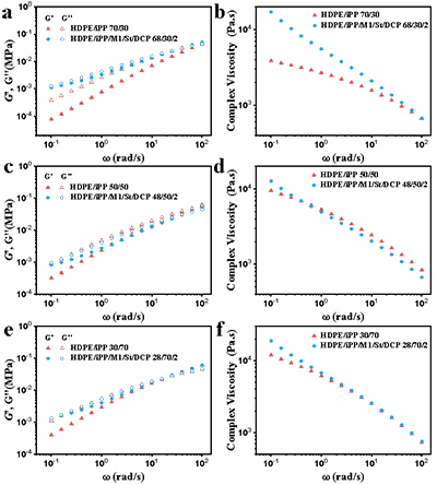 图3. HDPE/iPP共混物在不同剪切频率下的流变学性能。