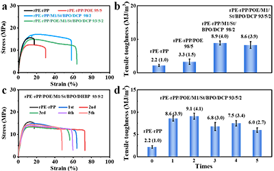 塑料的多次回收再利用是解决塑料污染最具成本效益的途径之一。为此,作者系统研究了超分子动态交联策略在废旧PE/PP混合塑料重复加工中的应用,即使经过5次加工循环,拉伸韧性仍保留了初始值的70%以上(图5c和d)。综上所述,作者证实了超分子动态交联策略不仅能高效处理成分不明的消费后混合聚烯烃,还能调控复杂三元体系中的相形态,为废旧聚烯烃的高值化机械回收提供了一种稳健的解决方案。