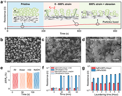 为了验证这一设计的鲁棒性,研究团队对其进行了一系列近乎“暴力”的测试。1)力电稳定性:在0-600%的循环拉伸下,器件的电阻变化极小。即使在600%拉伸状态下直接进行RCA耐磨测试,电阻依然保持稳定。扫描电镜图像显示,拉伸和磨损后,AgPs与LMPs界面发生了“粒子融合”,反而进一步巩固了导电通路(图2)。2)耐腐蚀性:将器件浸泡在强酸或强碱溶液中,AgPs/LMPs双层电极在300%的循环应变下,电阻波动仅为10%。相比之下,无封装的液态金属电极表面氧化层被溶解,导致导电性彻底破坏。3)耐水洗与生物相容性:经过6小时的模拟洗衣机洗涤,双层电极的电阻漂移小于20%,而纯液态金属电极的电阻暴增234倍。细胞毒性实验显示细胞存活率>95%,皮肤贴片实验无刺激反应,银离子的存在还赋予了电极优异的抗菌性能。