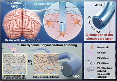 图1 水凝胶光纤皮芯界面在植入后组织微运动下的失效机制示意图,及其通过原位动态聚合构建AHO稳定融合界面