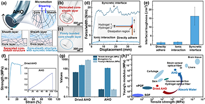 图2 AHO的机械性能(a)微运动下两根纤维界面变化的示意图;(b)OWHF和(c)AHO经模拟微运动载荷后皮-芯界面的光学显微镜示意图;(d)剥离曲线,力/宽度与位移的关系;以及(e)三个界面相互作用不同样品的界面韧性;(f)干燥和湿润的AHO的应力-应变曲线;(g)干燥湿润的AHO的伸长率、拉伸强度及杨氏模量;(h)AHO与其他纤维拉伸强度及杨氏模量的比较图。