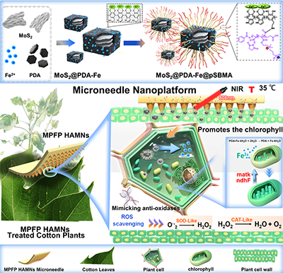 近日,石河子大学化学化工学院贾鑫教授,孙美州博士团队,提出一种刺激响应型微针-纳米酶协同平台,通过构建植物-材料生物界面,实现了在温和近红外光触发下的精准养分释放与活性氧清除,为应对气候变化下的农业可持续发展提供了新材料策略。